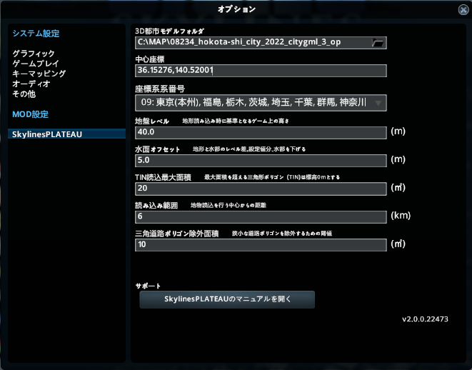 実際の設定方法ですが、GitHUBの「Cities: Skylines PLATEAU MODのマニュアル」のサイトを参照していただければよいと思うのですが、わたくしたやっていて、困ったり悩んだりした箇所だけ示したいと思います。